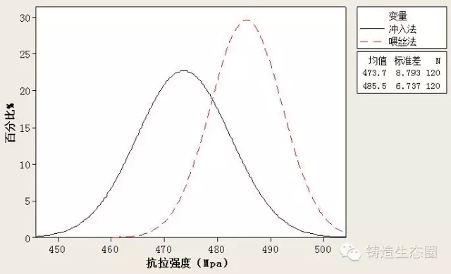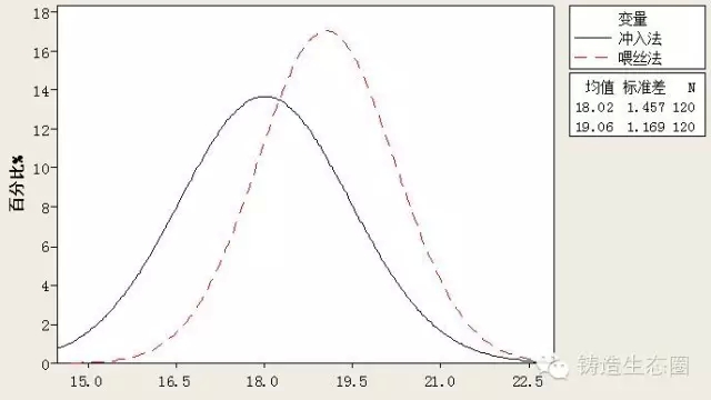 (3)力学性能对 凯发登录随机抽取冲入法和喂线法生产桥壳的力学性能试棒各120组数据,分析结果如图3、图4所示: