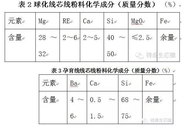 (1)包芯线的选择 国外一些经验不建议选用高Mg含量的包芯线,Mg含量过高,球化反应剧烈,Mg的烧损多,渣量大。一般建议选用Mg含量为30%左右,并选用含Ba孕育线,能有效防止孕育衰退。我公司使用的包芯线的主要参数为:外包钢皮厚度0.4mm,芯线直径为13mm。包芯线主要成分见表2、表3,使用前应注意检查包芯线外观应圆整,无裂痕、漏粉等。