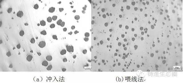 (2)金相组织对比 选取铸件同一位置打磨观察金相,拍取的金相图片如图2所示。相对于冲入法,喂线法生产的铸件的石墨球更多、更细,且圆整度也更好。
