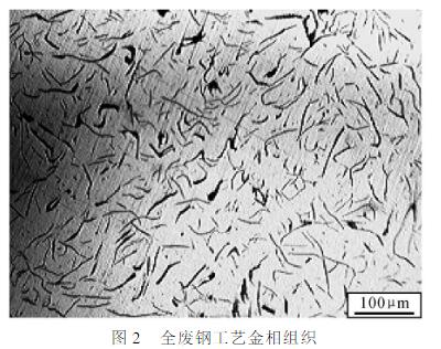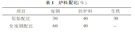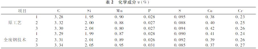 对全废钢技术(废钢+增碳剂+合金)和原工艺(废钢+生铁+合金)两种方案按相同的化学成分进行对比试验,铁液化学成分见表2。