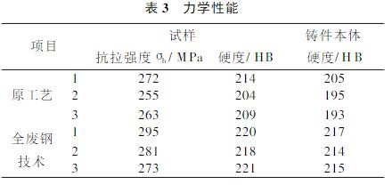 力学性能试验采用10t万能强度试验机检测抗拉强度,布氏硬度计检测硬度。对采用全废钢技术生产的铸铁和原工艺两种方案分别进行检测,结果见表3。