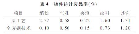 2.4质量情况 采用全废钢技术方案进入批量生产后,对产品质量情况进行了统计,并与原工艺方案对比,具体见表4。