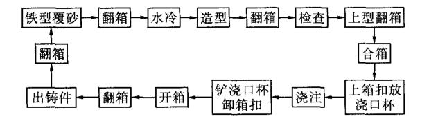 生产制动鼓铸件采用封闭式的铁型覆砂铸造生产线,可连续生产,工艺流程见图3。生产线配套造型机、合箱机、翻箱机、出铸件机以及输送辊道,形成封闭的生产循环。生产线生产率为20型/h,配套熔炼设备为1.5 t中频炉。