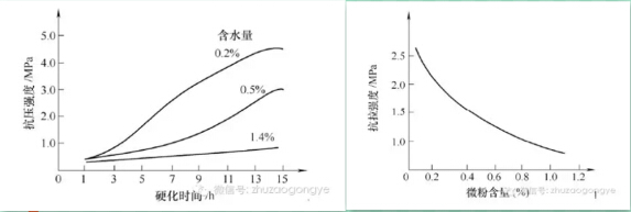(5)原砂的含水量 原砂含水量的增加常导致树脂砂三个方面性能的恶化:即树脂砂强度的下降;树脂砂的发气量与发气速度增大;硬化速度与起膜时间的延长。在生产中应严格控制原砂含水量不得高于0.2%。如原水中含水量由0.2%增至0.6%,型砂强度将降低50%左右,甚至更多,见表5,对硬化时间的延长影响,见图1。 表5 原砂含水量对树脂砂强度的影响