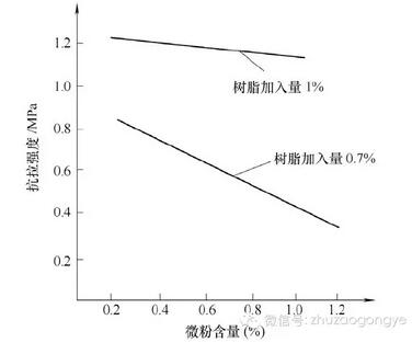 目前在工厂不检验再生砂的发气量,而用再生砂的灼减量大小来表征发气量的高低。 再生砂中的微粉不仅增加树脂砂的发气性,也影响树脂砂的强度。树脂砂加入量越低,微粉含量对强度的影响越显著。因此,树脂加入量较低时则更要把再生砂的微粉含量控制在0.2%以下。图13为微粉含量对树脂砂24h后强度的影响。