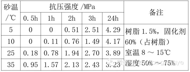 表12 国产磺酸固化剂技术指标 砂温管理是树脂砂工艺中十分重要的一环,砂温控制在20~30℃为宜。表13为砂温对型砂强度的影响。 表13 砂温对型砂强度的影响