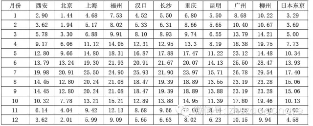 表10 环境温度与绝对湿度的关系 相对湿度是实际含水量与绝对湿度的比值,用百分数来表示。如梅雨天气相对湿度可达95%,但温度仅有20℃,则梅雨天的含水量=17.29×95%=16.42(g/m3) 表11 为我国10城市与日本东京1月至12月的空气中含水量的统计。