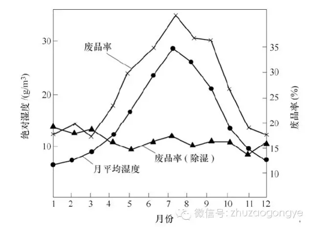 图8为铸件废品率与空气湿度的关系。图中表明7~8月湿度最高,含水量**,温度达35℃时相对湿度为60%,相对湿度虽不如梅雨季节的95%,但其含水量比梅雨季节还高,含水量=39.61g/m3×60%=23.76g/m3。统计表明,其相对应的铸件废品率最高。图中也表明,在冲天炉供风湿度控制在5~7g/m3后,废品率显著减少。上述表明无论是铁液质量还是树脂砂质量,环境变化影响是不可忽视的因素。