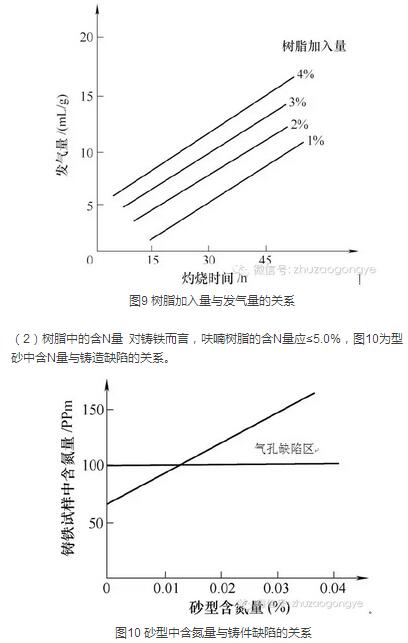 由表13可知,砂温5~10℃时,初始强度低,无法起膜,35℃以上,初始强度高,但可使用时间短,终强度低。因此,必须要具备强有力的砂温度调节器。下列情况者应要更加重视:生产率高,气温高的地区,砂子降温工作量大;生产率不高,间断生产周期长且气温低的地区,砂子升温工作量大。对于造型线上砂温控制更为重要。为什么星期一树脂砂起膜性能差,为什么星期四、星期五的树脂砂可使用时间短,来不及造型制芯,这都是砂温造成的。 大量的经验表明,冬天时对金属模型加热十分重要。美国企业在冬天时常用红外线或热风加热生产线上的模具。确保了铸型的硬化速度与起膜时间。型、芯在合箱前的存放期间受到环境影响,吸湿是不可避免的。合箱后采用热风烘烤对防止气孔,提高铸型表面稳定性十分有效。尤其在温度低、湿度大,型芯存放时间长时更为重要。日本用250℃左右的热风在浇注前从铸型浇冒口进入,对合箱的铸型进行吹烤。国内有的铸造厂已将上述措施纳入工艺。 三、树脂砂发气量的问题 树脂砂发气量大,发气速度快并集中形成发气的峰值,这是呋喃树脂的第三个缺点,解决的措施是两个方面:一是减少发气量;二是强化排气系统。 1.减少发气量 多年统计表明,气孔、夹渣、缩松往往在铸造缺陷中排列前三位,不少工厂气孔占首位。树脂砂对气孔是十分敏感的,下列三个方面对树脂砂发气量影响**:即树脂的加入量,树脂的含N量及再生砂的灼减量。 (1)树脂加入量 检查一个工厂树脂砂质量控制的好不好,首先看它树脂加入量是多少。树脂加入量保持在1.0%~1.2%的范围内为合格,加入量0.8%~1.0%为良好。日本控制在0.8%~1.0%的范围内。 树脂加入量与发气量是线性关系,见图9