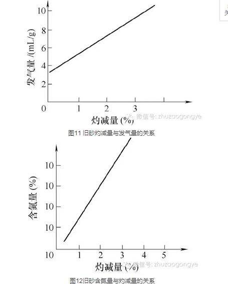 (3)再生砂中的灼减量 灼减量是旧砂中残存的有机物的度量,它是再生砂效果的表征,同时也是含N量与发气量大小的表征,见图11、图12。