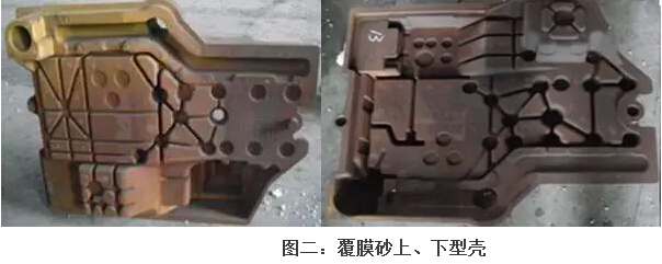 图二:覆膜砂上、下型壳 4.生产试制 汽车前悬连接架铸件生产试制选用二台单工位射芯机(一次射砂量40㎏);分别制取上下覆膜砂型壳;生产效率较高。同时生产对工人的技术要求较低。为保证铸件的表面质量,选用较细粒度的覆膜砂(50/100目),覆膜砂性能:发气量:≧15ml/g;树脂含量:2—2.5% 。熔化设备为1.0t中频感应电炉。生铁选用济钢生铁,球化剂选用QRMg8RE3,孕育剂选用75硅铁。该铸件为铁素体基体铸件,且铸件的轮廓尺寸大、壁厚较薄,为使铸件不出现渗碳体,在该铸件的铁水球化及孕育处理上,采取较高的出铁温度1 530℃∽1550℃,浇注温度控制在1360-1390℃;较低的原铁水含硅量,采用多次孕育。铸件的化学成分为: C:3.8-3.95%;Si:2.7—2.9%;Mn: ≤0.3%; P≤0.06%;S﹤0 .02% ;M g:0.03— 0 05%;Re:0.02一0.045%。铸件出品率80%左右。与树脂砂铸造相比,节约生产成本大约35%,经济效益显著。铸件的外观及内在质量和尺寸精度均符合技术要求。 5.总结 通过对汽车前悬连接架铸件的覆膜砂铸造生产实践,生产薄壁大轮廓、高精度、高质量的汽车铸件,覆膜砂铸造有着较强的技术优势和经济优势;能显著提高汽车铸件产品内外观质量,降低铸造生产成本,从而进一步提高企业生产铸件的综合竞争能力。 参考文献: 李远才 覆膜砂及制芯技术 [M] 北京 机械工业出版社 2007.12 **作者: 高成勋 男 |