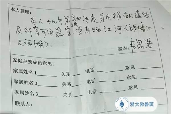 韦思浩老人的善举还不止于此,他在十几年前就决定要在身后捐献自己的遗体和所有可用器官,还签了遗体捐赠志愿表。