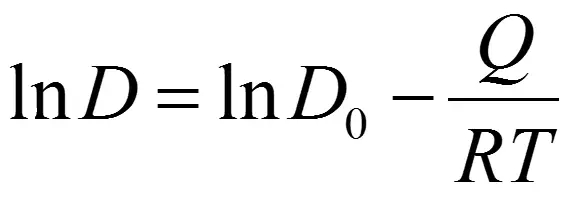 C——碳的浓度、D——扩散系数、t——时间、x、y、z——三维空间坐标,扩散系数与时间的关系: